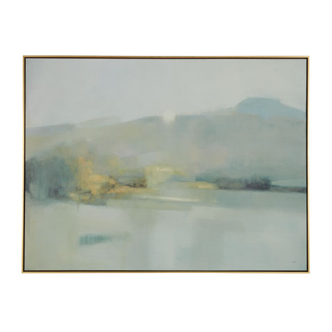 Strokes of pink, obsidian, goldenrod, and pale yellow convey a sense of place; washed grays communicate the fog of years past, the obscuring of a mental image whose particulars have receded with time. A tender, transitional addition to any space.